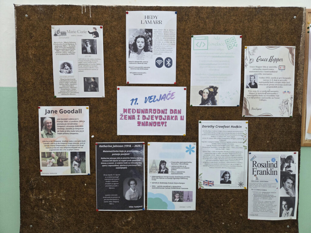 11. veljače obilježava se Međunarodni dan žena i djevojaka u znanosti pa su učenici 6. i 7. razreda na satu informatike razgovarali o znanstvenicima i njihovim izumima. Prva asocijacija učenicima bili su znanstvenici poput Alberta Einsteina, Nikole Tesle, Charlesa Darwina itd., no žena se nitko nije sjetio. Stoga su učenici na satu informatike s učiteljicom Agnješkom Bolf Petković istražili koje žene su sudjelovale u oblikovanju svijeta kakvog danas poznajemo. Saznali su puno zanimljivosti kao na primjer da je Ada Lovelace napisala prvi računalni algoritam te se smatra prvom računalnom programerkom, Katherine Johnson svojim je preciznim izračunima pomogla astronautima da slete na Mjesec, a Marie Curie otkrila je radij i polonij te je pomogla bolje shvatiti radioaktivnosti i upotrebu radijacije, zbog čega je dobila Nobelovu nagradu… Učenici su nova saznanja zapisali i napravili prigodne letke kako bi proširili svijest o ženama u znanosti te možda inspirirali nove znanstvenice.